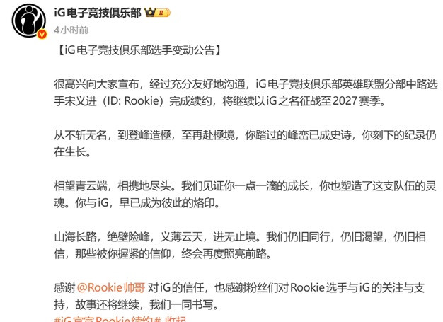 这里面比较令人惊讶的点有两个,第一就是Rookie是续约两年,一直到2027年,也就是说Rookie至少还要再打两年,IG愿意给Rookie开两年的合约,可以说给予Rookie足够的尊重了,要知道Rookie现在处于生涯末期,是有可能在未来出现断崖式下滑的。