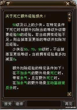 规则上目前流传的是50级以上,特定条件死亡额外掉经验,经验不够就掉等级!特定死亡条件如下: