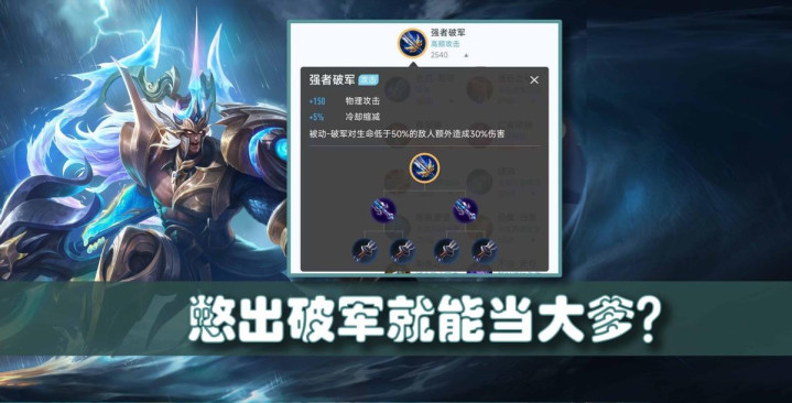 前期在攻速、穿透、自身坦度都不足的情况下,强行憋一件破军提供的基础物理伤害,也会导致自己的输出刮痧、生存堪忧、打起来很被动。破军是一件适合后期作为伤害补强的装备,千万不要前期硬憋!