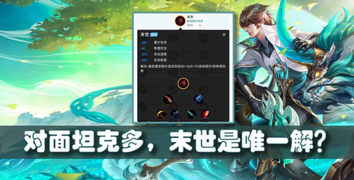 打不动坦克的原因有很多,比如英雄自带的免伤机制,或者是敌方开了苍穹,又或者是护盾增加双抗……所以在你核心装备没成型前,不要对末世过于执着。不过末世对于25分钟后的超级兵线清理,还是很有用的。