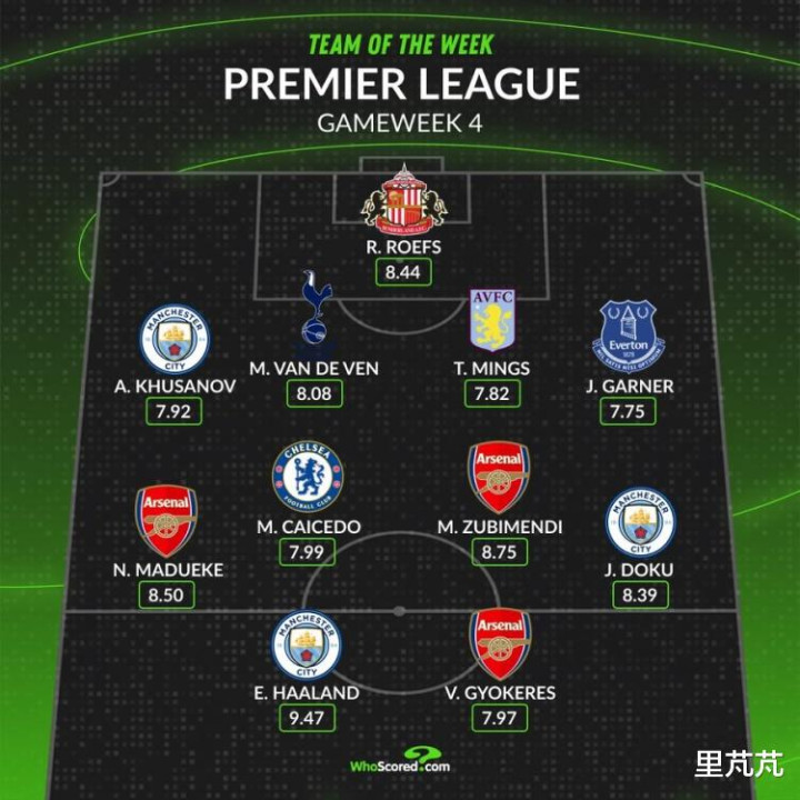 英超第4轮战罢,WhoScored根据球员评分列出本轮最佳阵容,哈兰德、约克雷斯搭档锋线,马杜埃凯、多库在列。
