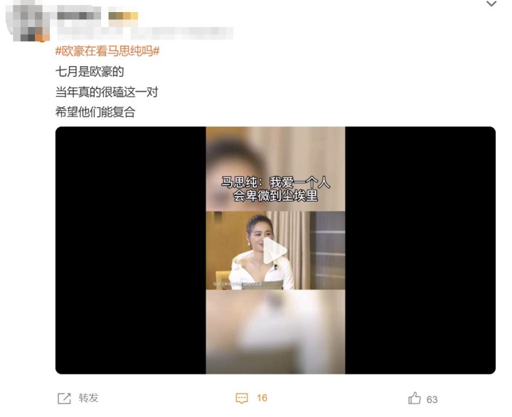 而最近的微博视界大会大会上,马思纯和欧豪的往事被重提,无数网友也期盼他们两人能复合。